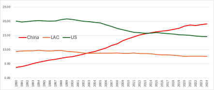 Figure 1: China, LAC and the US GDP (share over world GDP in PPP in current USD)