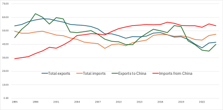 Figure 2: Total Trade and Bilateral Trade of the US with China in Medium and High-Technology Goods (percentage shares over total US trade): 1995-2024